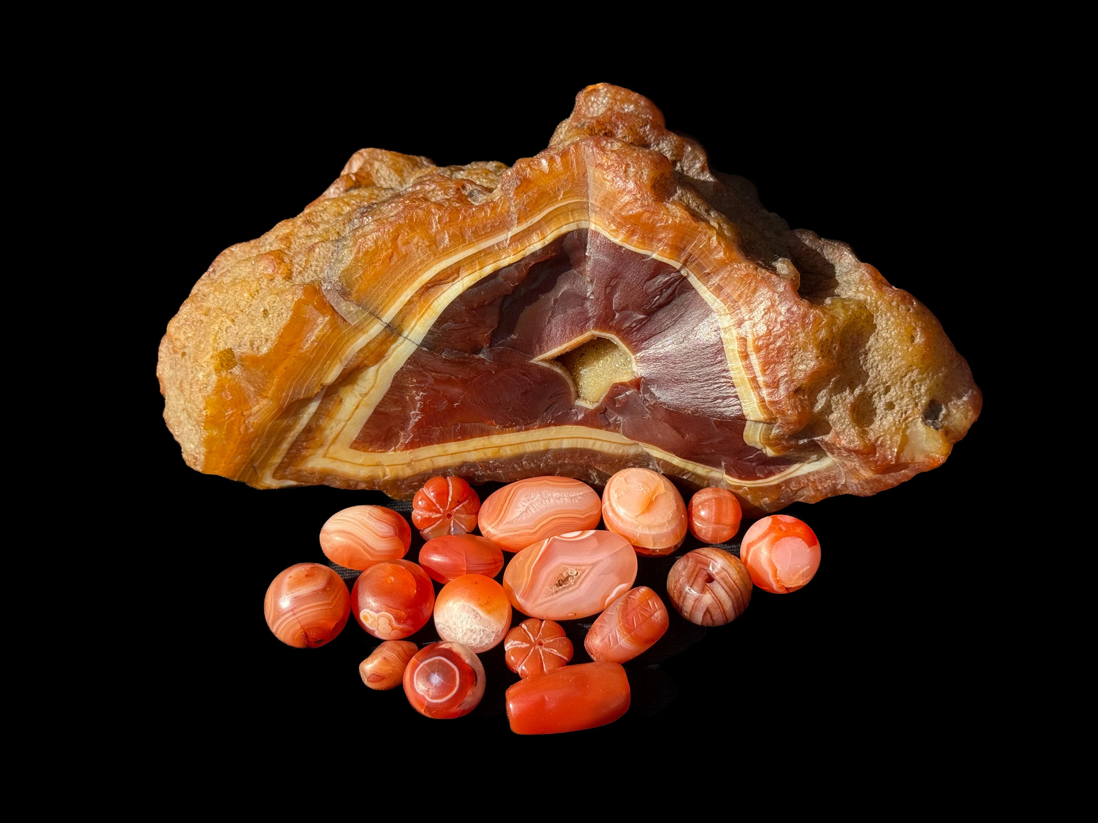Found mainly in India, Brazil, and parts of Egypt, carnelian glows in shades of orange and deep red.